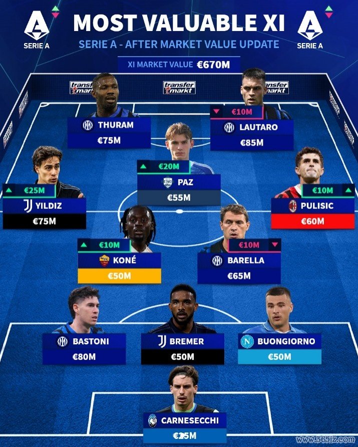 意甲最贵首发:伊尔迪兹普利西奇帕斯在列,国米四东说念主入选