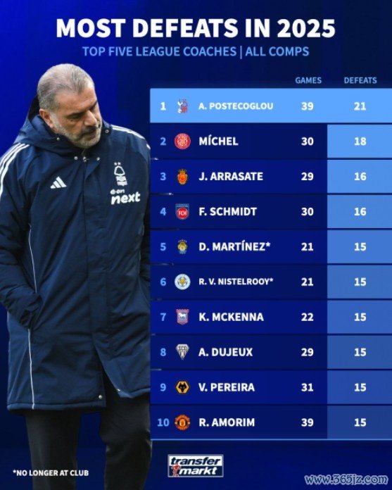 2025年五大联赛主解说输球场次名次:澳波21场居首,阿莫林15场