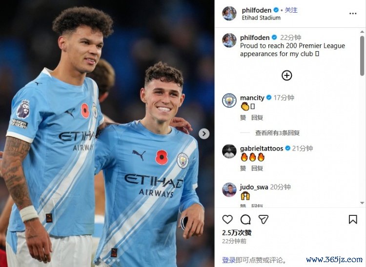11月3日讯 2025-26赛季英超第10轮,曼城3-1降服伯恩茅斯。本场比赛是曼城中场福录取200场英超比赛,赛后他在支吾媒体晒图,庆祝这一里程碑。