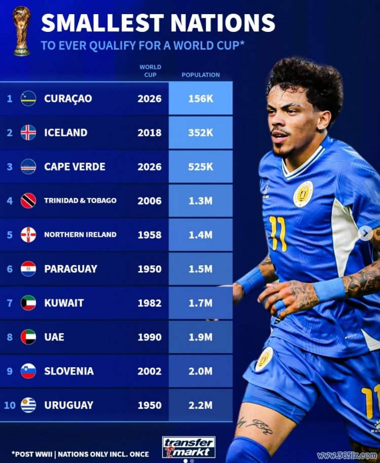11月20日讯 世初赛现时仅剩多个附加赛限额待定,库拉索以15.6万东谈主成为二战之后晋级宇宙杯的东谈主口最少国度,《转会阛阓》也统计了二战之后晋级宇宙杯东谈主口最少的国度前十。
