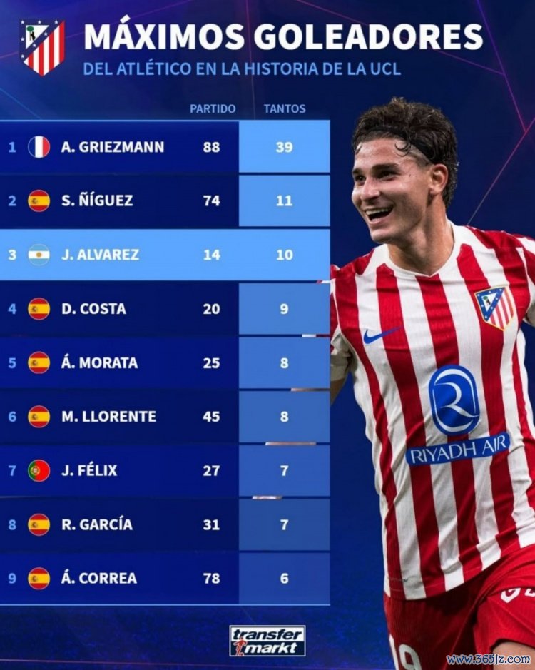 马竞队史欧冠进球榜:格列兹曼居首,阿尔瓦雷斯14场10球第三