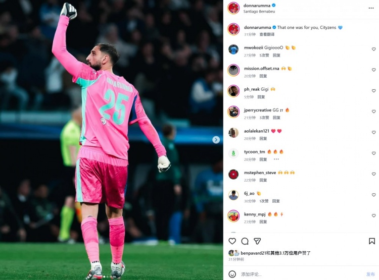 曼城门将多纳鲁马也在赛后晒出本场相片,配文写谈:“这是献给你们的凯旋,曼城球迷们!”