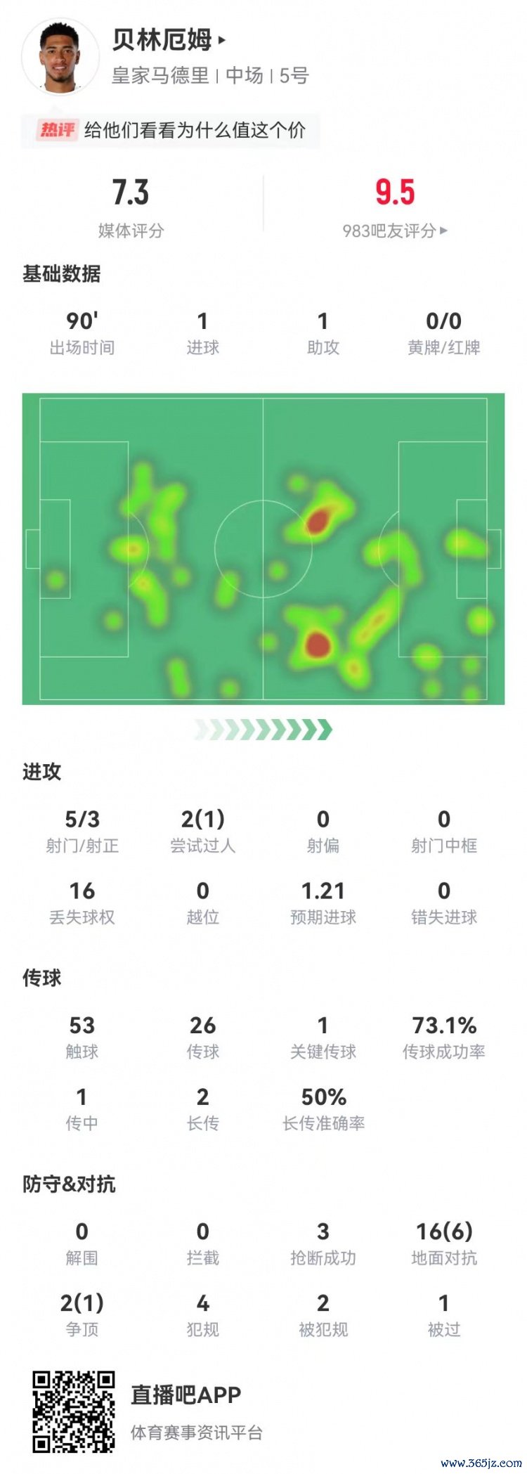 贝林厄姆本场5射3正进1球 1助攻+1要道传球 18抗拒7到手+3犯规