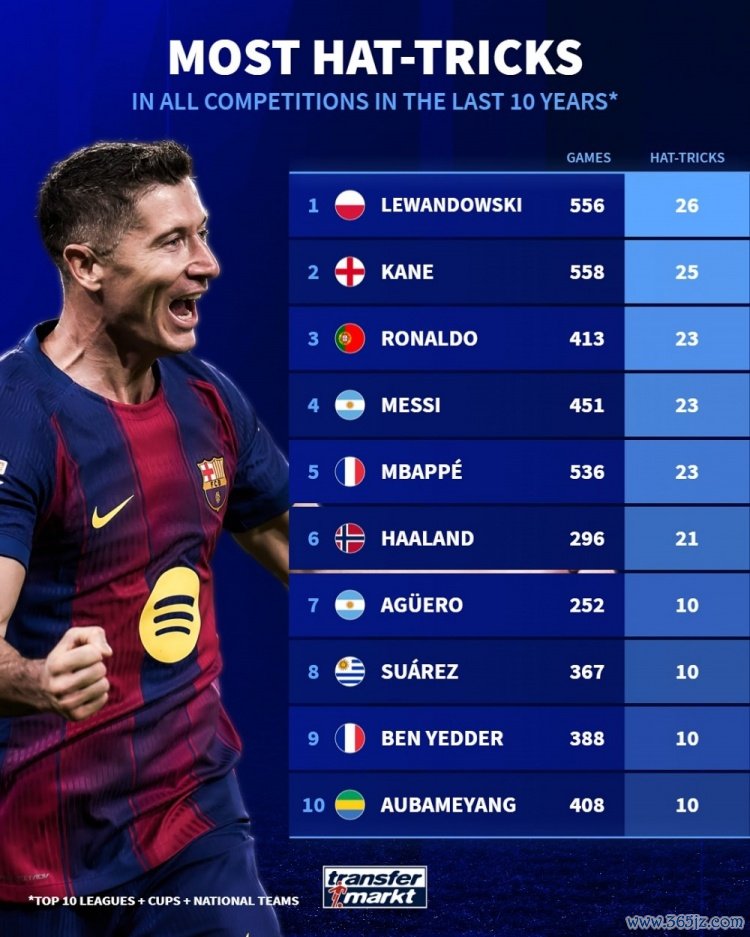 近10年前十联赛戴帽次数排行:莱万26次居首,凯恩25次、梅罗23次