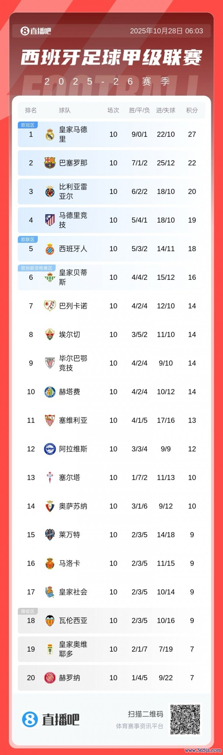 西甲积分榜:皇马10轮擢升巴萨5分,黄潜第三,马竞第四