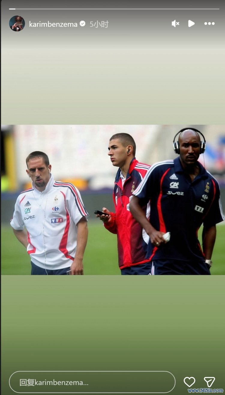本泽马社媒晒出我方以前在法国队的相片,里贝里、阿内尔卡出镜。