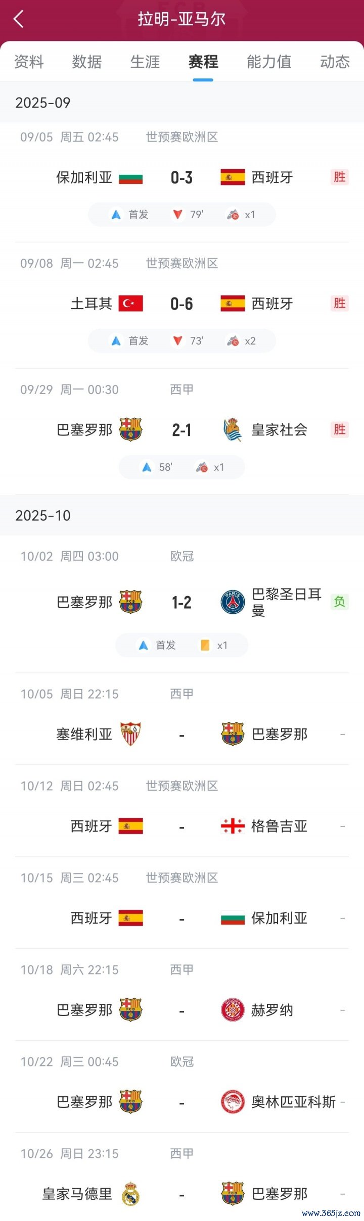 10月04日讯 巴萨官方音讯,亚马尔因耻骨不适症状复发,将缺席对阵塞维利亚的比赛,瞻望复原技术为2-3周。