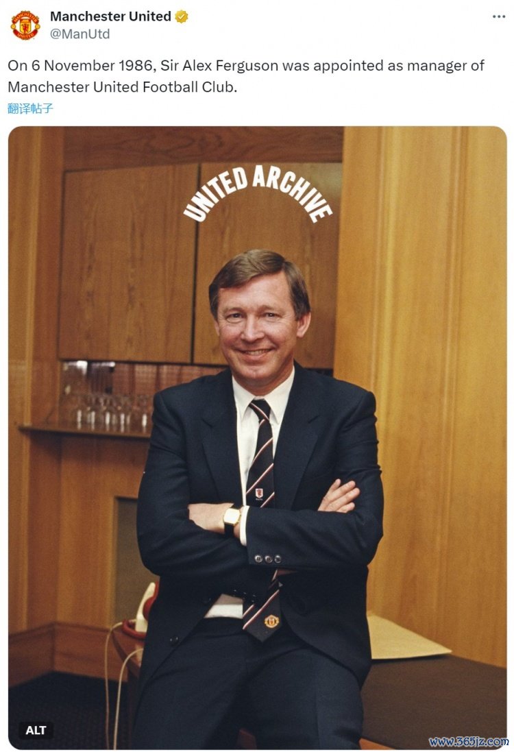 1986年11月6日,弗格森被任命为曼联主帅,曼联官方社媒晒出弗格森的相片,操心这个相称的日子。