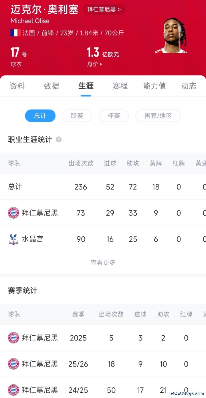 2024年夏窗,奥利塞以5300万欧元的转会费从水晶宫加盟拜仁,于今出战73场比赛29球33助,现在奥利塞的德回身价照旧达到了1.3亿欧元,他与拜仁的条约将在2029年到期。
