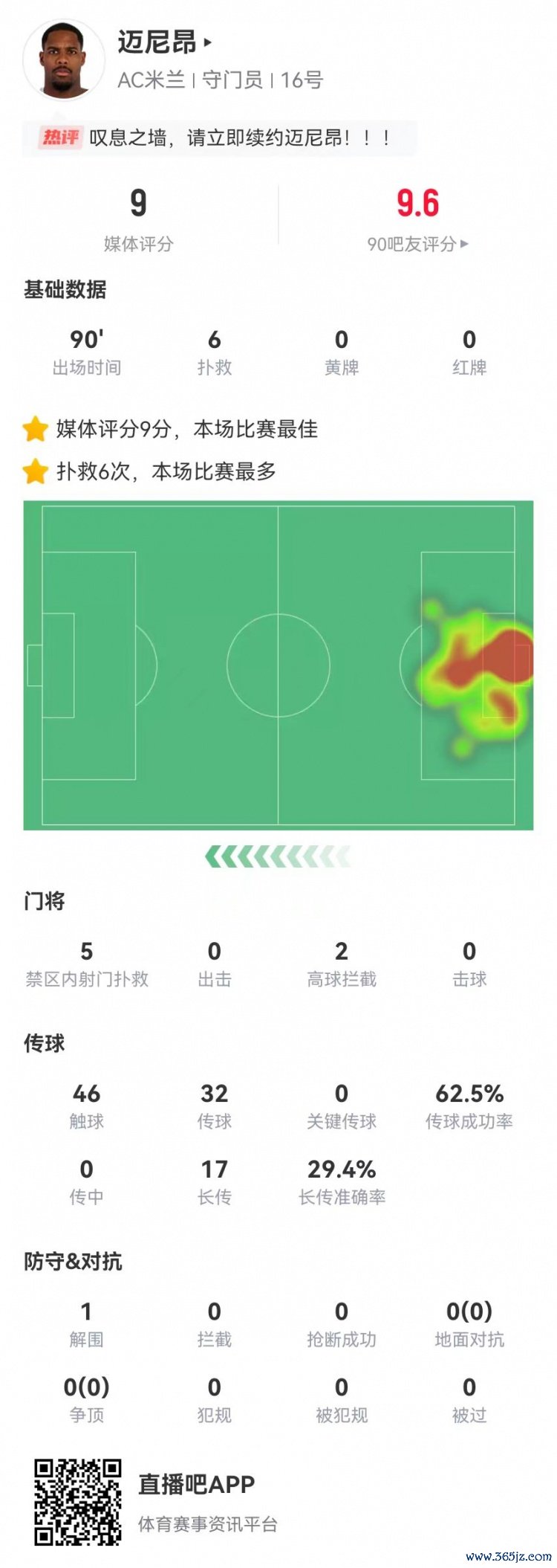 感慨之墙!迈尼昂本场6次扑救+2高球阻扰 获评9分全场最高