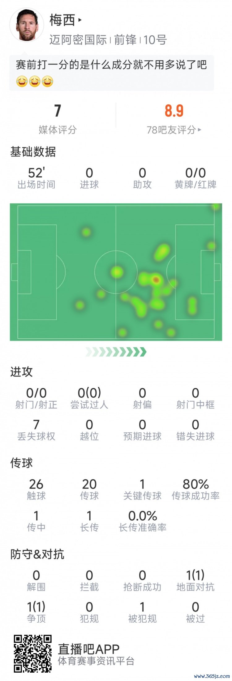 梅西半场数据:射门、过东谈主挂零,1次重要传球,2次扞拒均到手