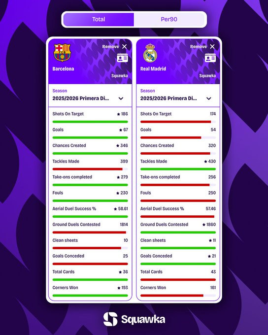 虎扑02月27日讯Squawka比赛赛季数据统计,对比巴萨与皇马两支队伍在本比联赛季至今西甲中的数据(巴萨在前):