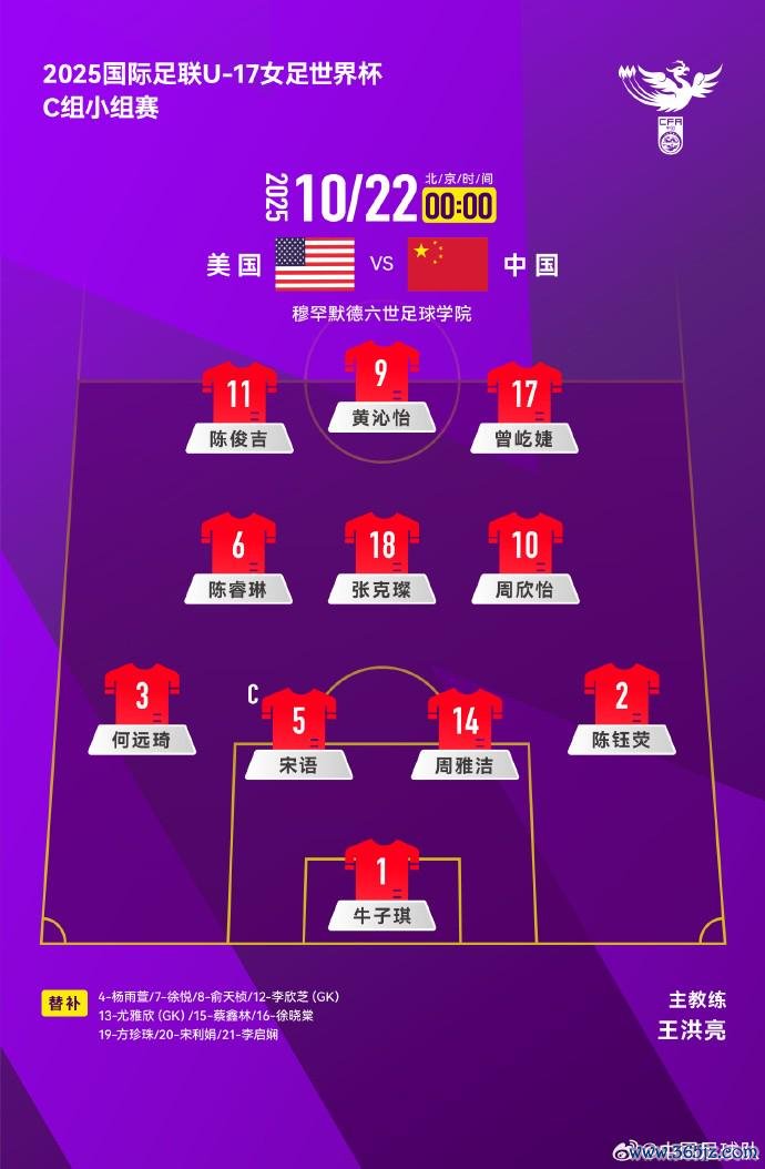 北京时分10月22日0:00,U17女足全国杯小组赛第2轮,U17中国女足对阵好意思国女足U17。赛前U17中国女足首发公布。